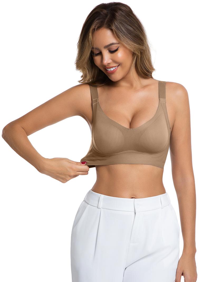 Key Features: 1.No steel ring design, comfortable all day without pressure, suitable for daily commuting, exercise or sleeping. 2. Widened shoulder straps,decompression without shoulder squeeze, say goodbye to squeeze marks and discomfort. 3. High elastic seamless fabric, skin-friendly and breathable, dry and not stuffy even in summer, bringing all-weather comfort experience. 4. Three- dimensional tailoring, natural chest support and gathering, widened side wings design, firmly wrap the side breasts, so that you can easily have a confident and upright posture. Elevate your wardrobe with the bra, combining functionality and style for all your bra needs.