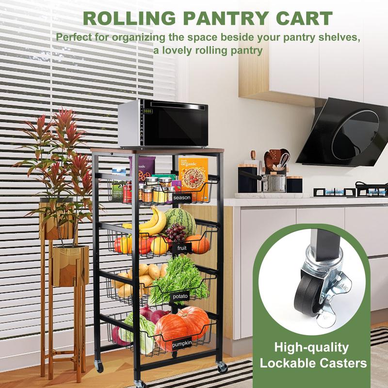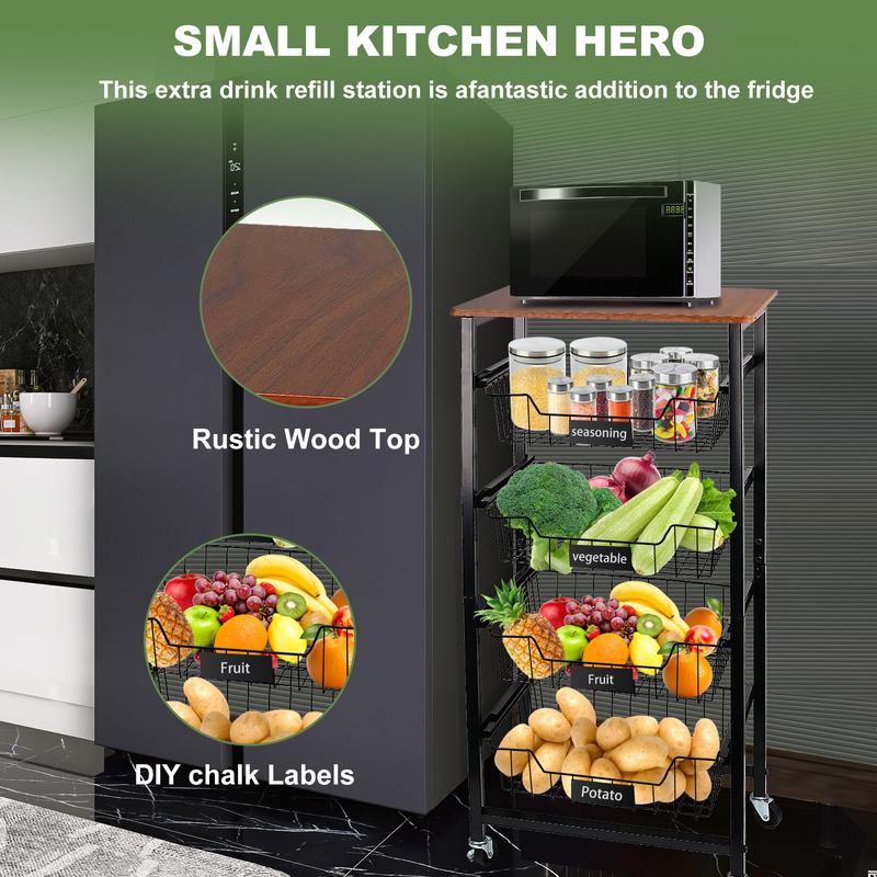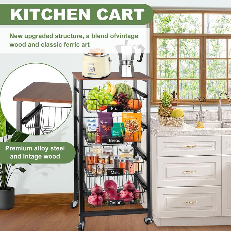 4-Tier Rolling Kitchen Utility Cart with Wood Top & Mesh Baskets - Mobile Storage for Fruits, Vegetables, Pantry, Laundry & More