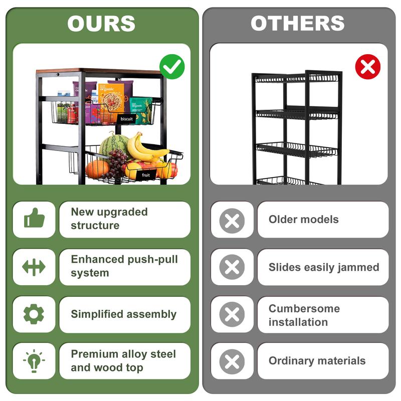 Large Capacity & Smart Design: The 4-tier structure (plus the wood top surface) offers ample vertical storage. Tilted front baskets ensure easy access to contents like fruits, vegetables, or daily necessities.