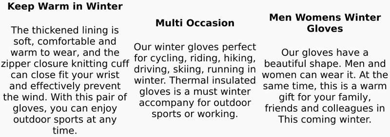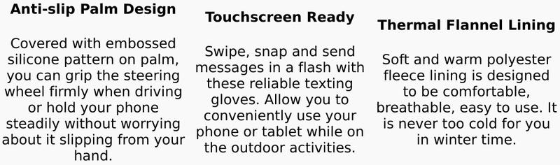 Portable and convenient: These winter gloves are super lightweight to carry, you will never need to take your gloves off in this cold winter when you want to play the phone.